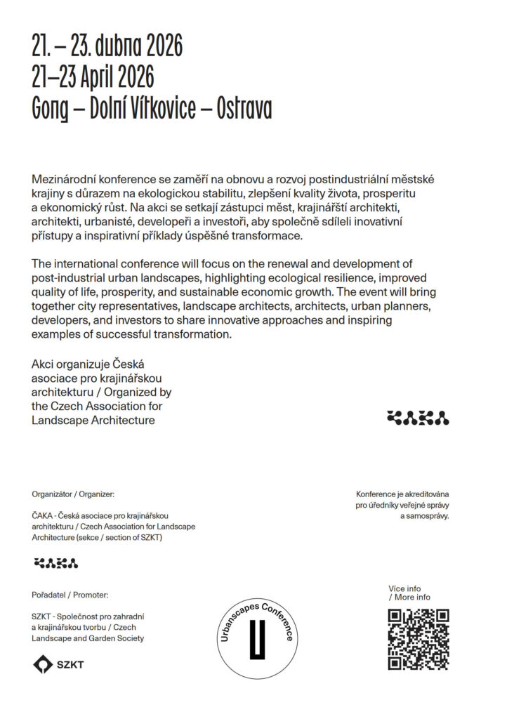 Registrace na konferenci Urbanscapes 2026 je již otevřena. Vstupenky je možné zakoupit online na oficiálním webu. Do 26. ledna 2026 jsou k dispozici zvýhodněné Early Bird vstupenky. Záštitu nad konferencí převzala IFLA EU.