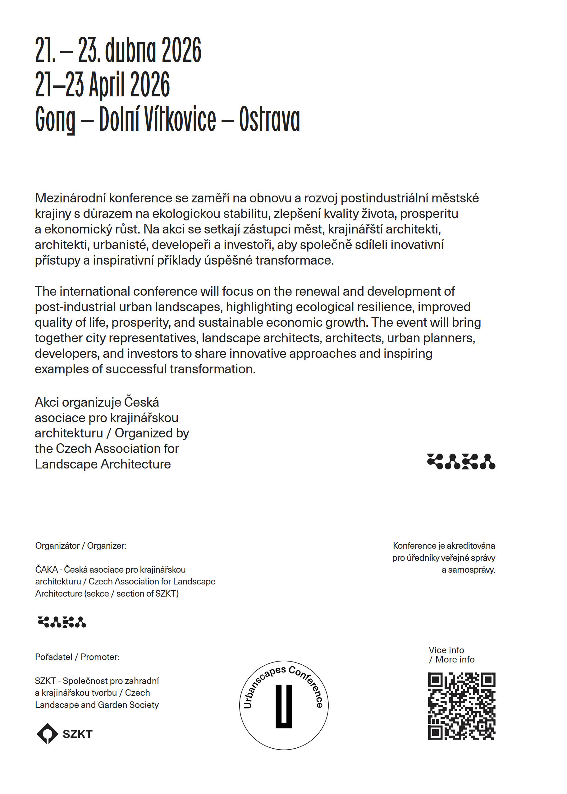 Třídenní setkání odborníků z oblasti krajinářské architektury, urbanismu, architektury, územního plánování, veřejné správy i akademického prostředí otevře témata obnovy a rozvoje rozmanitosti krajiny – společenské, kulturní i přírodní. Ukáže potenciál krajinářské architektury, urbanismu a architektury jako účinných nástrojů transformace a správy krajiny. Přinese inspiraci, jak posílit kvalitu života obyvatel, posílit místní identitu, ekologickou stabilitu, sociální soudržnost, ale také atraktivitu pro investory, developery a další aktéry.