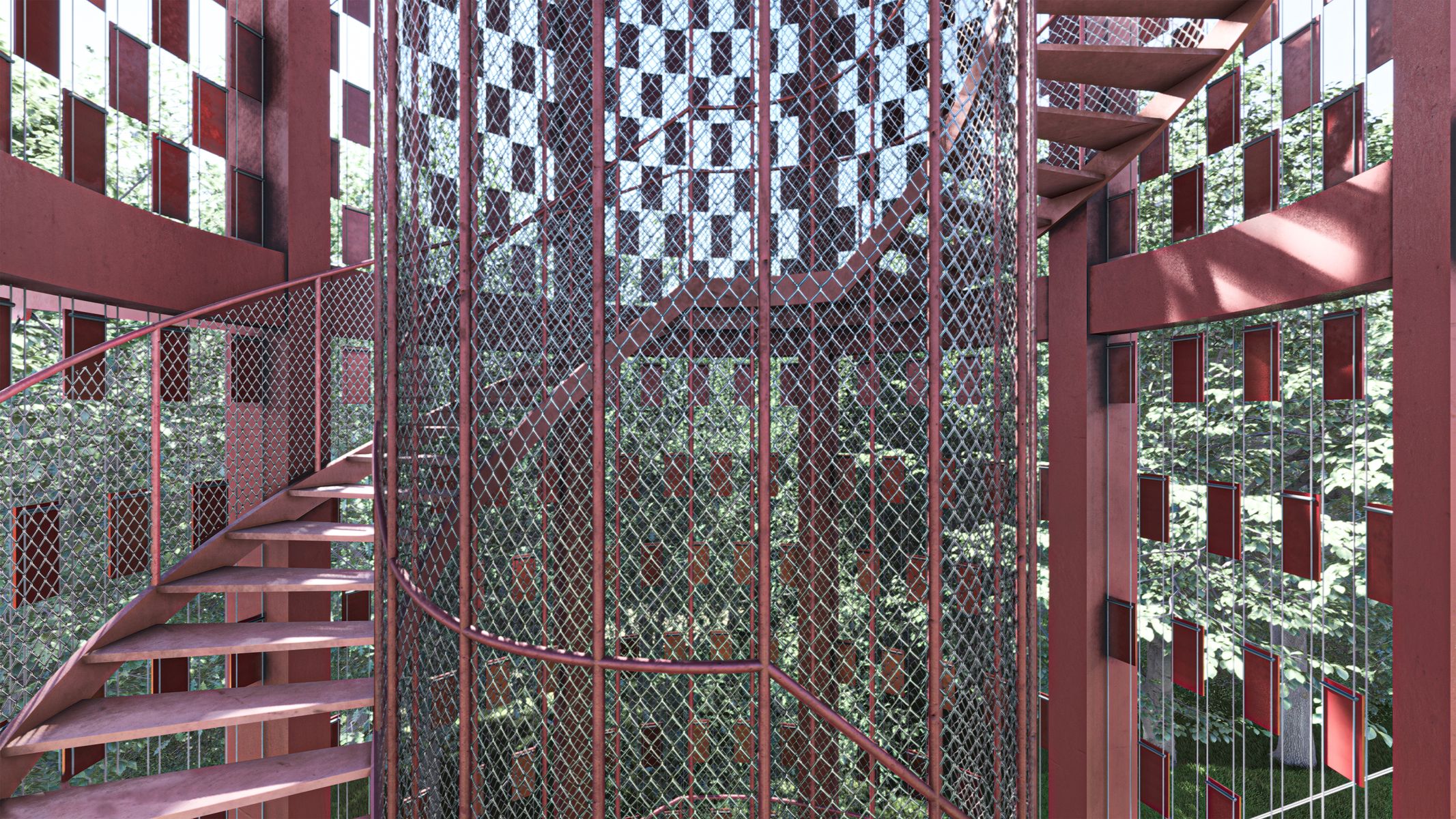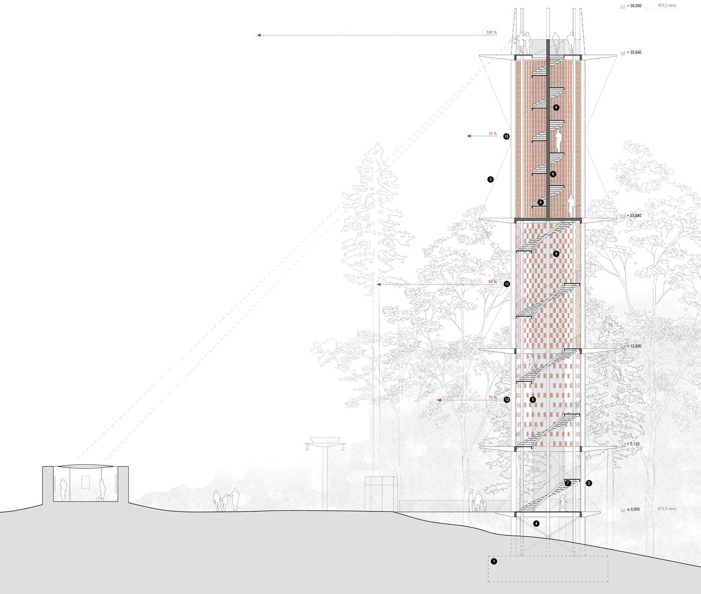 Prožitek výstupu je koncipován jako architektonická sekvence. V dolní části se návštěvník pohybuje po obvodu věže v bezprostředním kontaktu s korunami stromů, zatímco se stavba směrem vzhůru postupně uzavírá. V horní části se schodiště přimyká ke středovému vřetenu, prostor se ztiší a zúží, aby se s posledním schodem náhle otevřel v plně panoramatický výhled. Součástí cesty vzhůru je i zastavení na odpočinkové podestě ve výšce 23 metrů, kde je umístěno sdělení donátora, jehož osobní tragédie se stala jedním z motivů vzniku stavby.