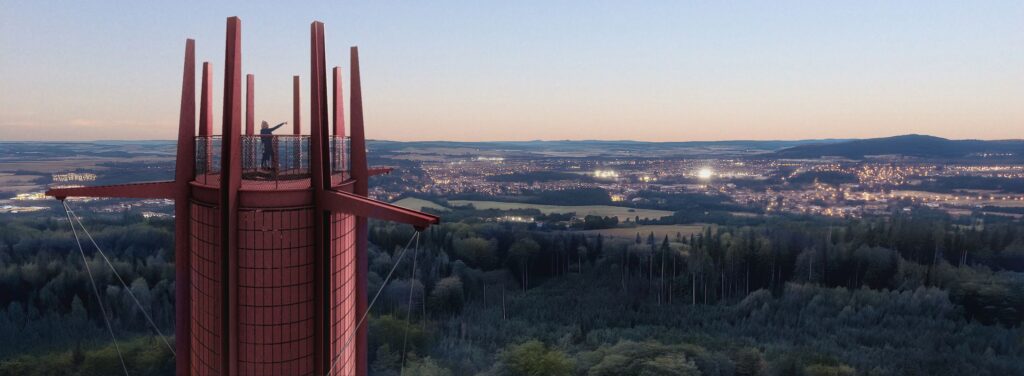 Projekt rozhledny na Šacberku není pouhou technickou stavbou ani solitérním monumentem. Je architektonickou interpretací paměti místa, pokusem převést historickou zkušenost do současného jazyka a vytvořit stavbu, která nebude jen „nabízet výhled“, ale také vyprávět příběh – o vzniku města, o zaniklé těžbě, o paměti, ztrátě a hodnotách, které přetrvávají i poté, co skutečné stříbro dávno zmizelo z útrob hory.