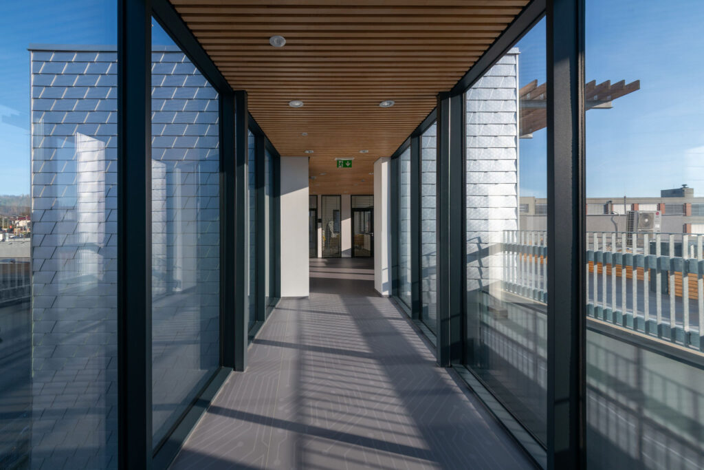 Z horních podlaží je možné vyjít na terasu v úrovni střechy původní budovy. Ta slouží nejen jako relaxační zóna pro zaměstnance, ale také jako místo s výhledem na okolní krajinu.