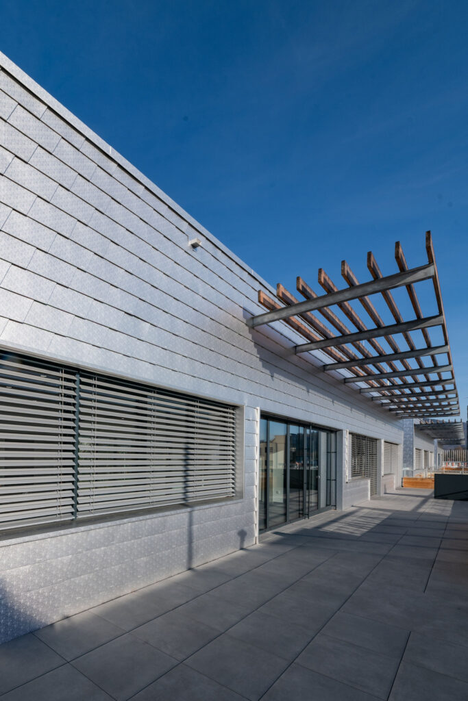 Objekt zaujme výraznou stříbrnou fasádou hliníkových šablon. Její jemně metalický efekt dodává objektu moderní, až futuristický výraz a zároveň zaručuje obvodovému plášti dlouhou životnost a minimální nároky na údržbu.