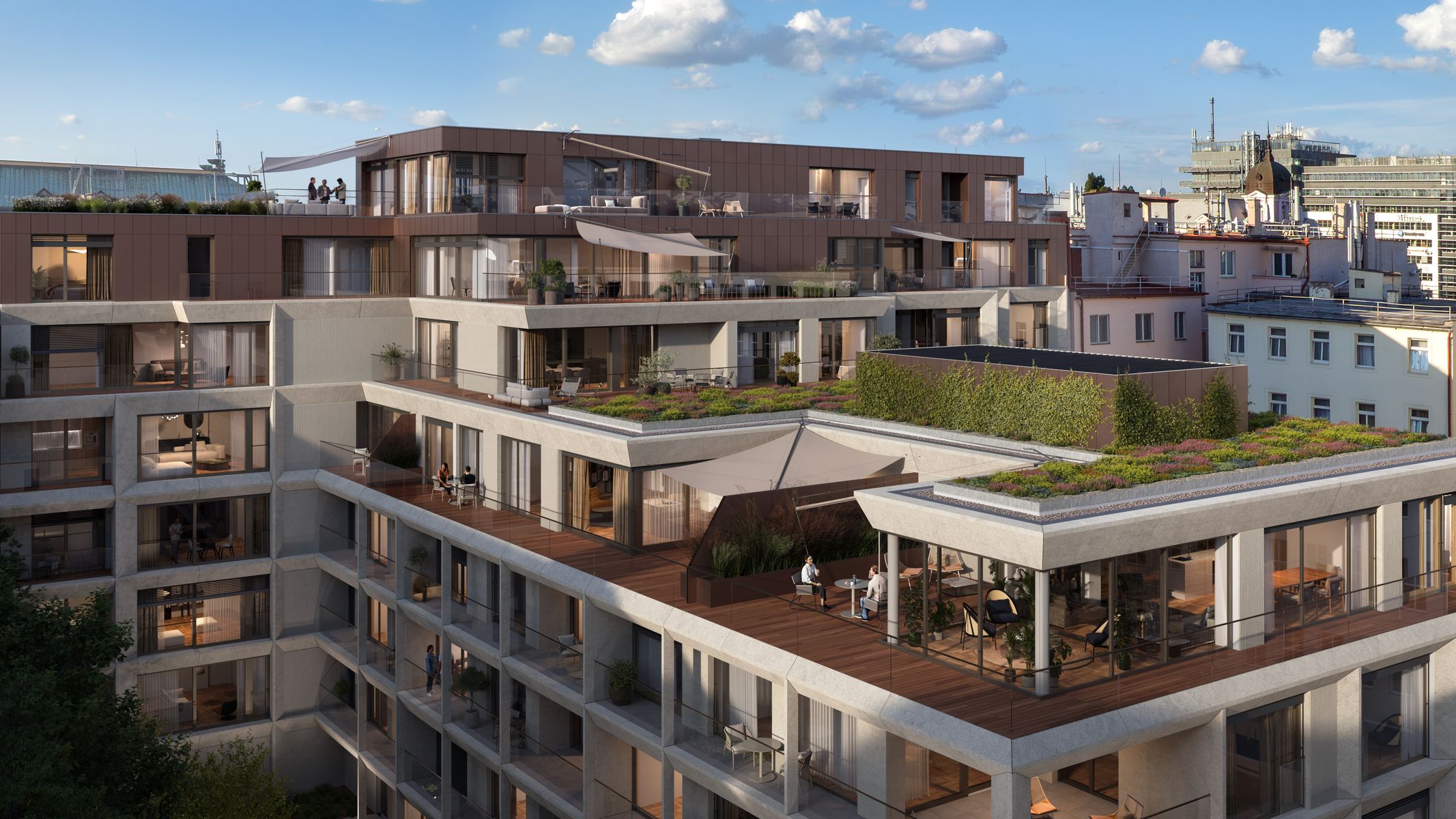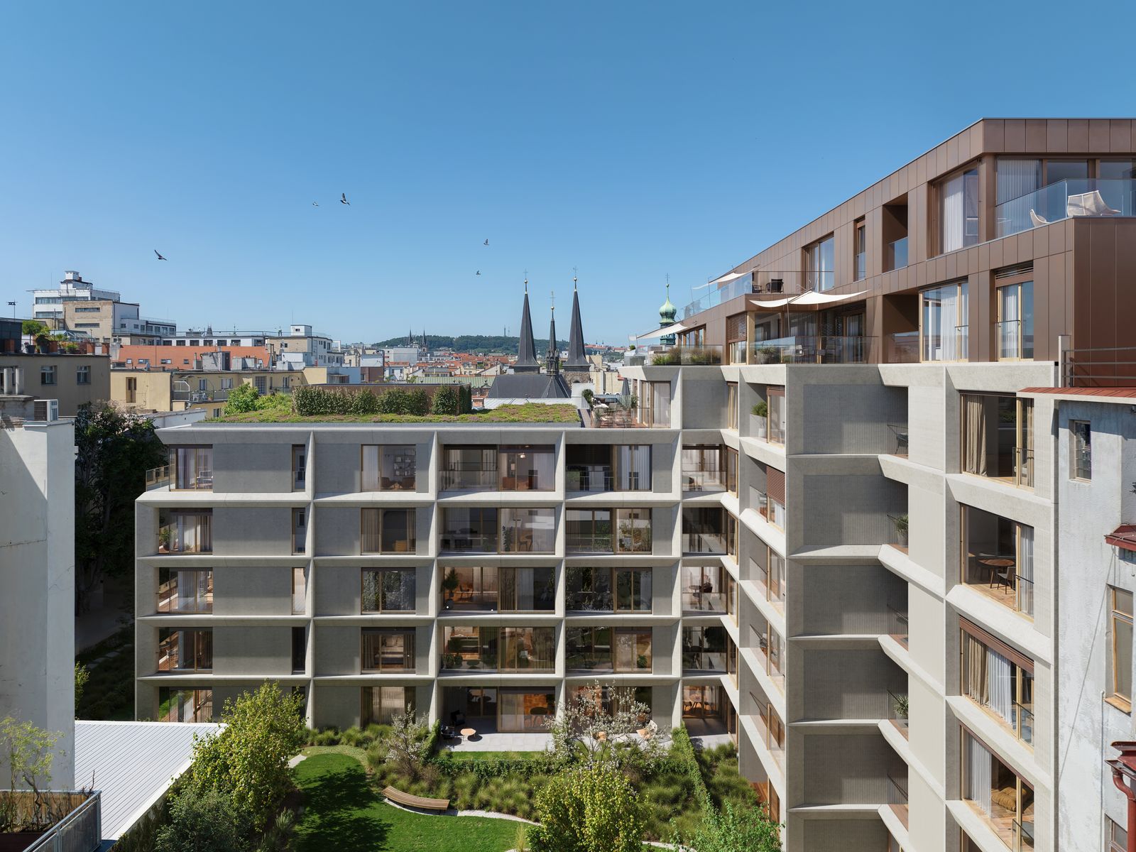 Důležitou roli hraje návrh vnitrobloku od studia Flera, který pracuje se zelení jako plnohodnotnou součástí obytného prostředí. Projekt zároveň využívá technologie zaměřené na snížení energetické náročnosti, včetně tepelných čerpadel a geotermálních vrtů.