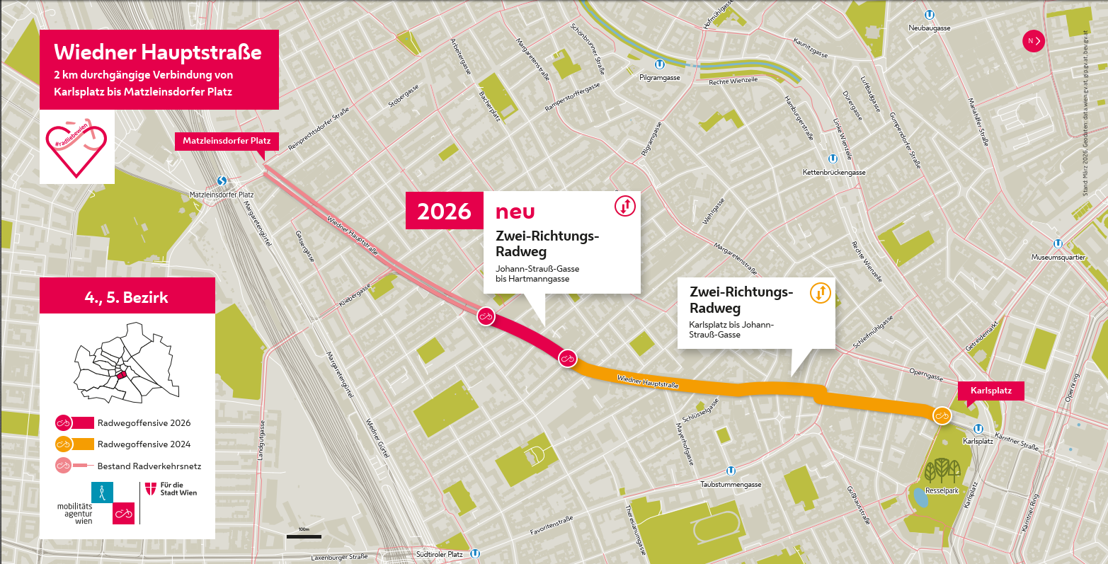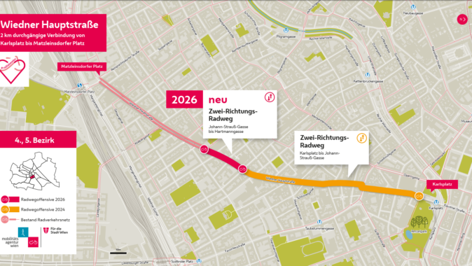 Rakouská metropole má za sebou pětileté období nejintenzivnějšího rozvoje cyklodopravy ve své historii. Od roku 2021 postupně modernizuje hlavní trasy a posiluje propojení mezi centrem, obytnými čtvrtěmi i rekreačními oblastmi. V roce 2026 plánuje realizovat 33 projektů, které přinesou přibližně 12,5 km nových cyklistických tras a odstraní slabá místa v síti.