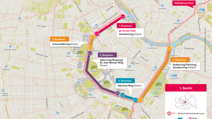 Zásadní proměnou projde jeden z nejvýznamnějších evropských bulvárů – Ringstraße, která obepíná historické jádro města. Úpravy se zaměřují na vedlejší jízdní pruhy a přilehlé ulice, jež se promění v přívětivější veřejný prostor. Přibudou širší chodníky, pobytové zóny a kvalitní cyklistická infrastruktura. Pěší i cyklisté získají jasně oddělené trasy, zatímco hlavní dopravní proudy včetně MHD zůstanou zachovány.