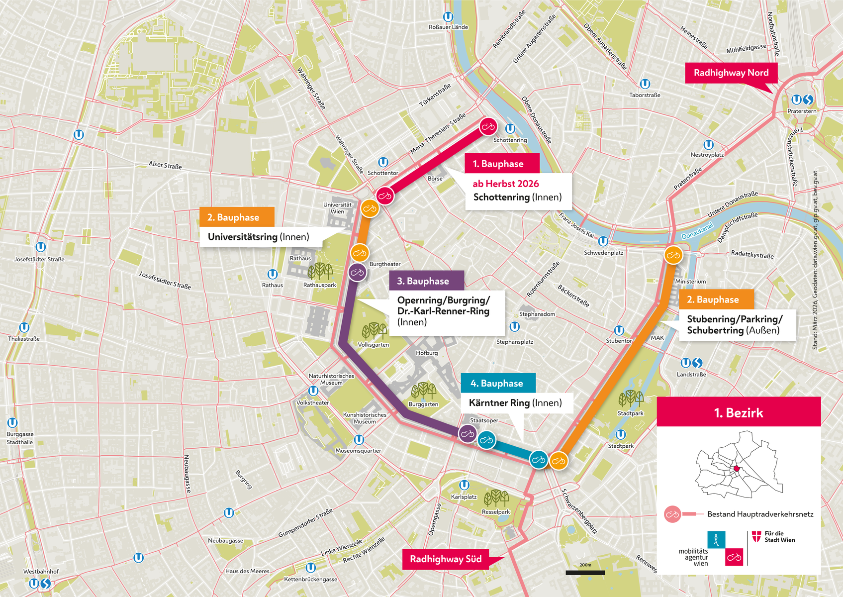 První etapa začne na podzim na úseku Schottenring, kde vznikne 4,5 metru široká obousměrná cykloalej. Součástí úprav je také rozšíření prostoru pro chodce, nové stromořadí a přibližně 900 m² zeleně. Povrchy doplní bezbariérová granitová dlažba odpovídající reprezentativnímu charakteru lokality. Proměna přinese i nový vizuální jazyk. Město zde poprvé využije pískově zbarvený asfalt, který odkazuje na historické jezdecké aleje a zároveň zlepšuje orientaci díky kontrastu vůči chodníkům. Urbanistický koncept nové podoby Ringstraße připravilo studio Gehl Architects, známé mimo jiné transformací newyorského Times Square.