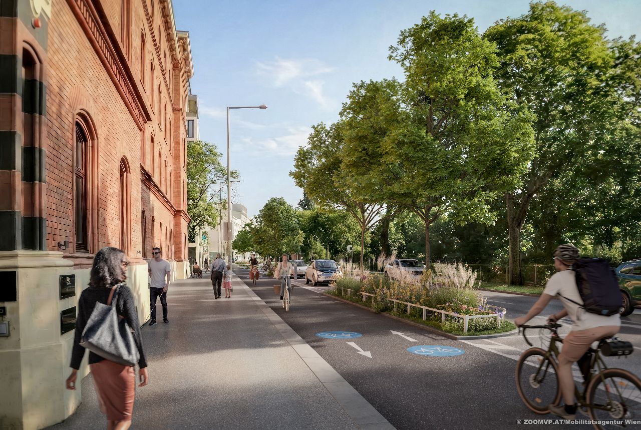 Další projekty se soustředí i mimo centrum. U Dunajského kanálu na Obere Donaustraße vznikne zhruba 410 metrů dlouhá obousměrná stezka, která odstraní nutnost opakovaného přejíždění mezi stranami ulice. Řešení pracuje s úsporným profilem – cyklostezka zůstává v úrovni vozovky a je oddělena zelení, parkovacím pásem a ochranným pruhem. Na západě města pokračuje přestavba Äußere Mariahilfer Straße, kde druhá etapa přinese více než 700 metrů nové cyklostezky a výsadbu stromů. Ulice bude nově jednosměrná, což umožní vytvořit vyváženější prostor pro všechny typy dopravy.