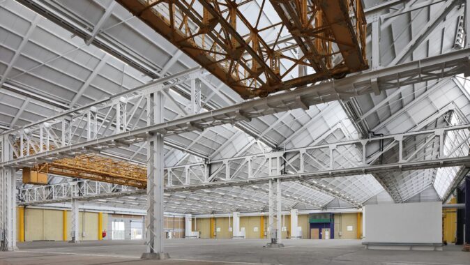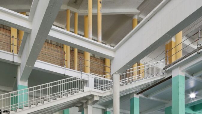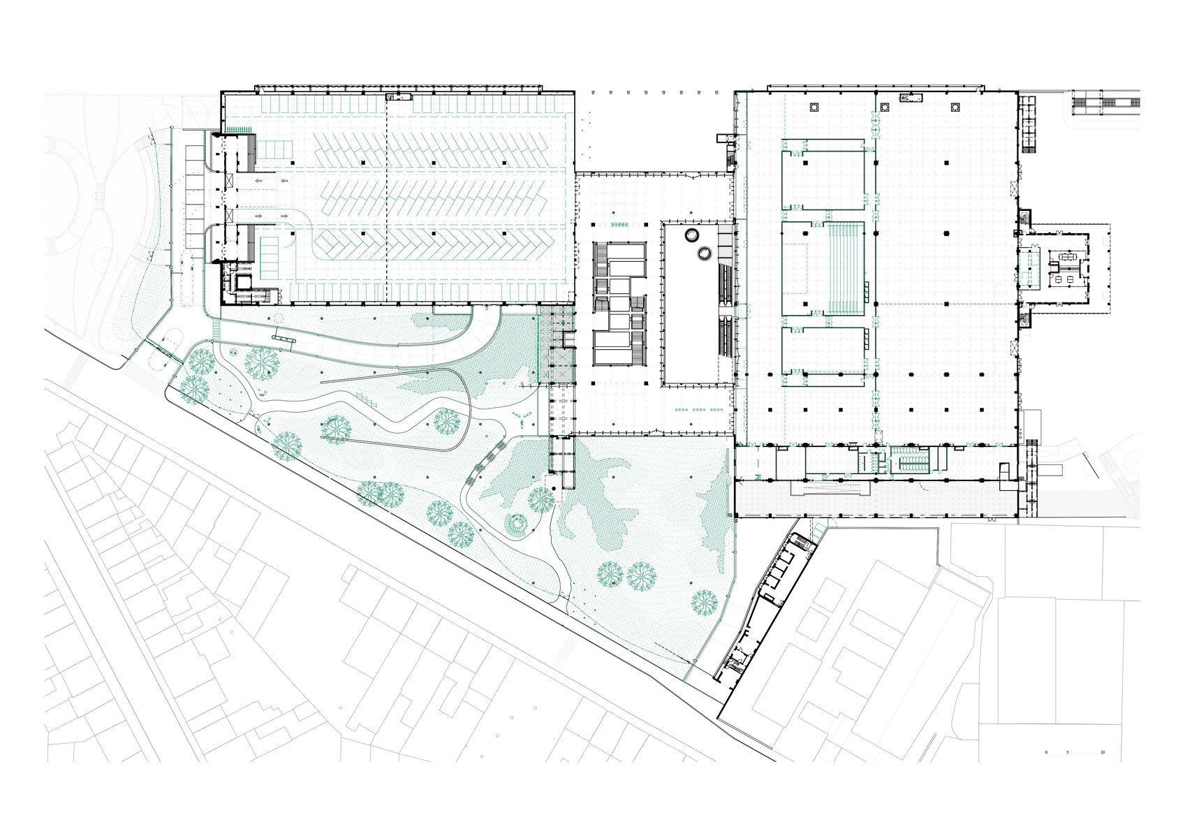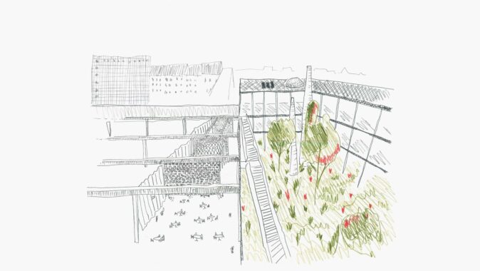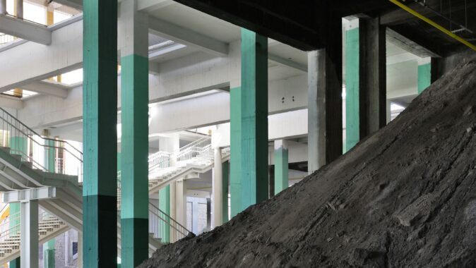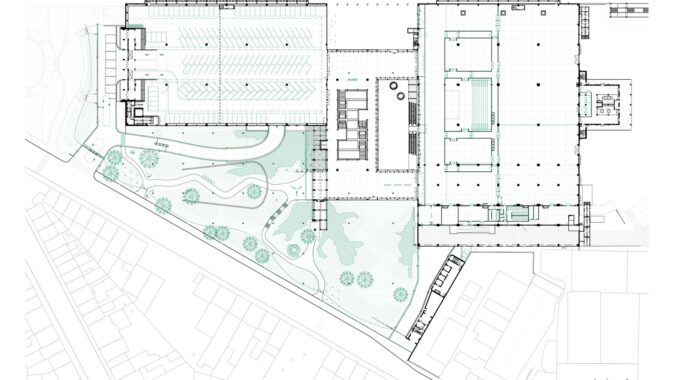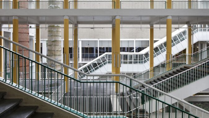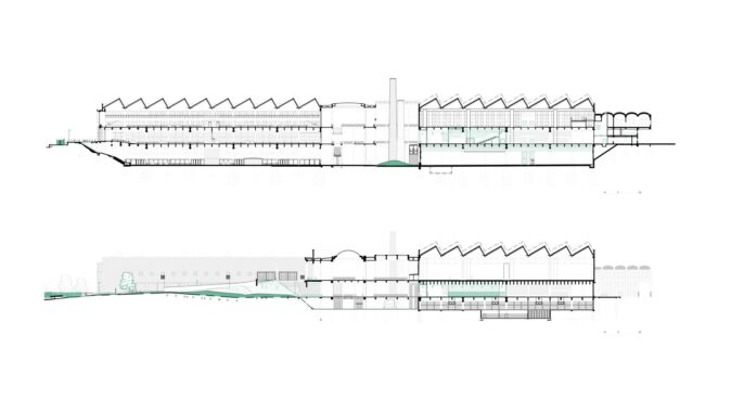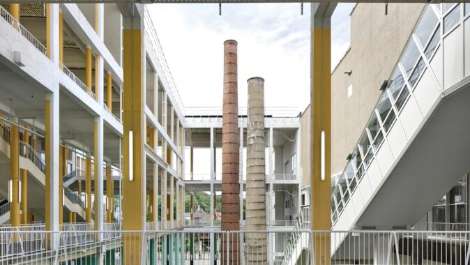 Původní záměr nahradit centrální halu nízkoenergetickou novostavbou narazil na omezený rozpočet. Architekti proto zvolili opačný postup: halu „odkryli“, odstranili její fasády a proměnili ji v krytý venkovní prostor. Do hmoty objektu bylo proříznuto atrium, které propojuje jednotlivé úrovně a vytváří vícepatrovou zahradu v jeho jádru. Selektivní demolice se staly nástrojem návrhu: odstraňování částí konstrukce umožnilo vznik nových kvalit – od přirozeně větraných prostor po proměnu zpevněných ploch v zeleň. Halda, na níž budova stojí, byla odhalena a osázena lokální vegetací. Demolované prvky se znovu uplatňují jako městský mobiliář. Materiálové zásahy jsou úsporné a čitelné – původní beton má bílý nátěr.
