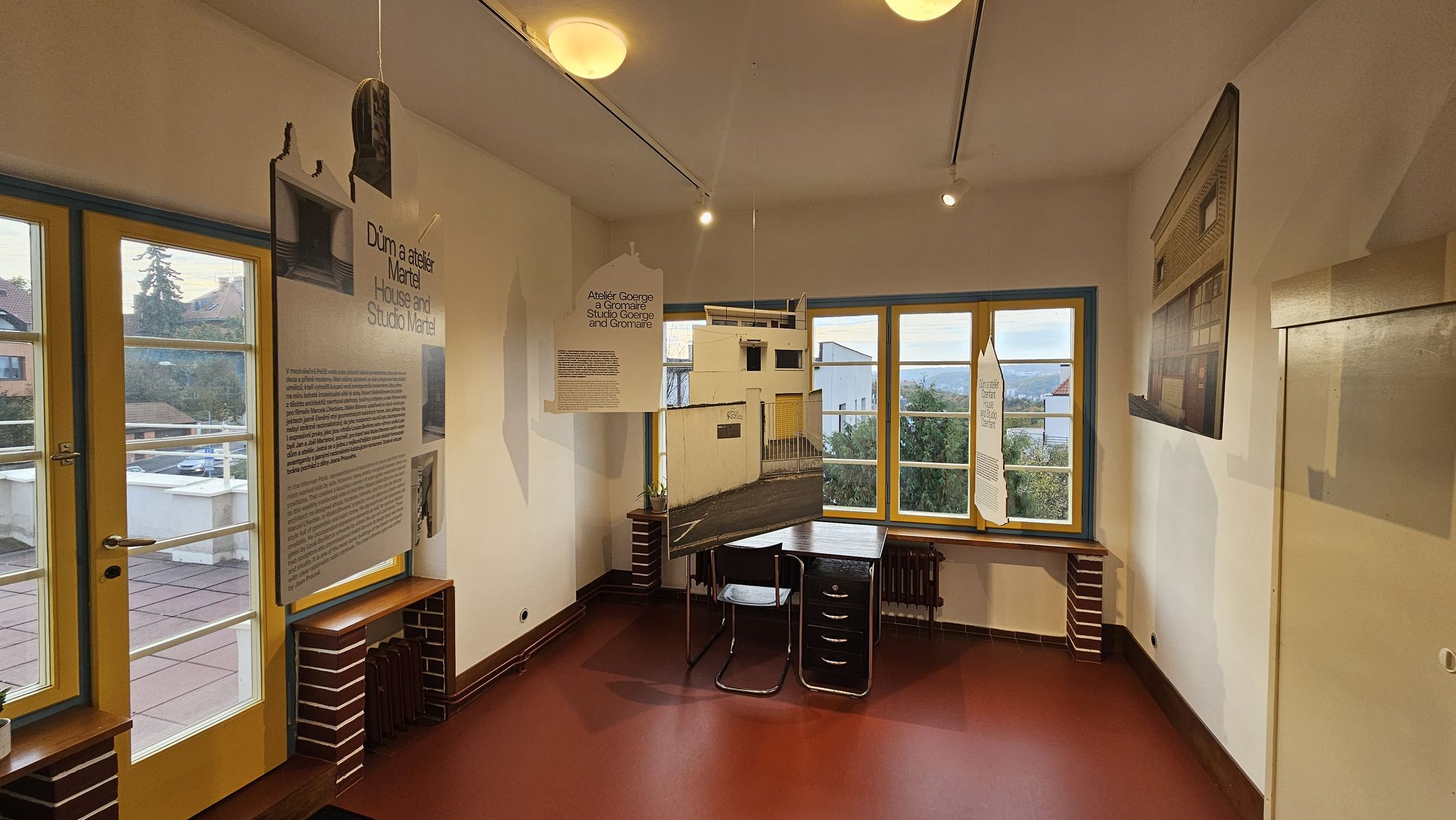 Prostřednictvím originální instalace autorských fotografií Adama Štěcha, kterou vytvořilo studio OKOLO, se tak návštěvníci mohou seznámit s ne vždy přístupnými uměleckými ateliéry a studii: Ateliérem Simon, Ateliérem Goerge a Gromaire, Ateliérem Lurçat, Domem a ateliérem Arp, Domem a ateliérem Doesburg, Ateliérem Orloff, Domem a ateliérem Martel, Domem a ateliérem Wogenscky/Pan, Domem Hajdú, Domem a ateliérem Philolaos, Domem a ateliérem Ozenfant a Domem a ateliérem Quillivic.